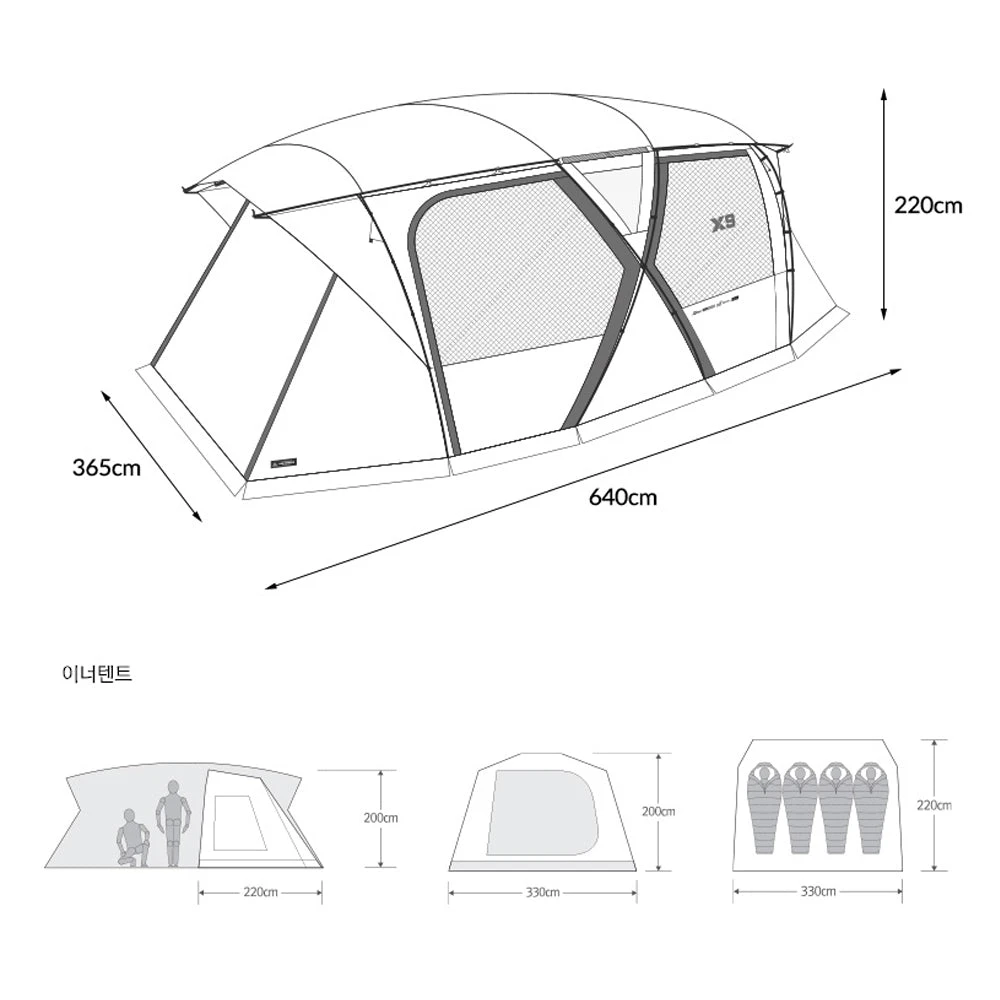 - Dimension: Â Upon installation – 640 x 365(H) x 220 CM | Storage – 80 x 35(H) x 35 CM | Inner tent – 330 x 220 x 200 (H) CM
